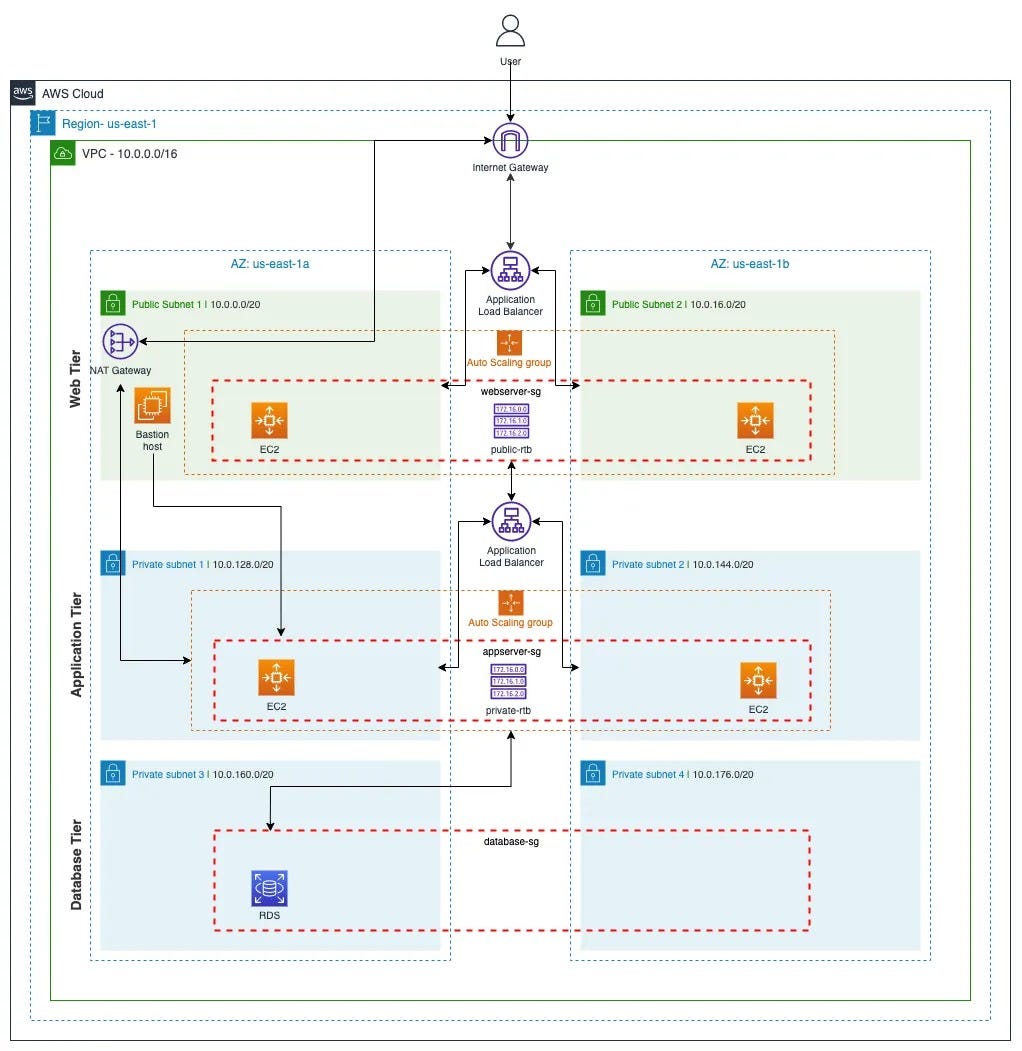 - Provisioned VPC, public and private subnets, route tables, internet gateway, NAT gateway, Application Load Balancer, EC2 instances, and RDS database.